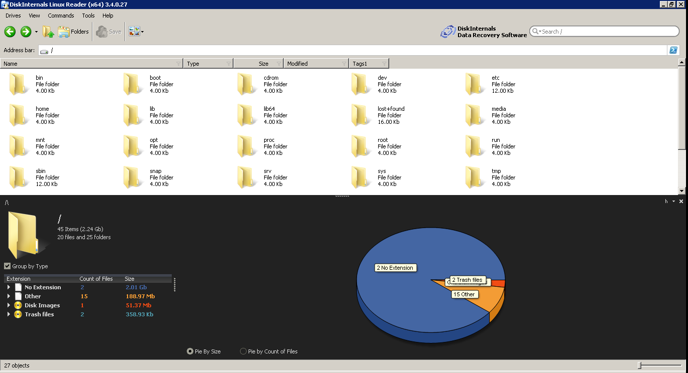 On the following screen you can see your linux partitions directories and files including disk stats. From here you can view, extract and save any data of linux partition on your Windows.